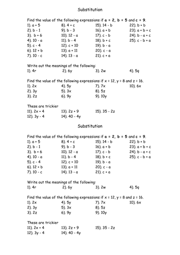 Systems of Equations Substitution Maze | Worksheet - Education Worksheet Systems of Equations Substitution Maze Help students hone their algebra skills by challenging them with this fun math maze! Designed for eighth-grade learners, this worksheet asks students to navigate their way through a maze by solving systems of two linear equations using the substitution method. Year 8 Substitution Worksheets - K12 Workbook Worksheets are Substituting into an expression substitute, Systems of equations substitution, Sorted it nailed it mastered it, Year 8 maths topic algebra linear equations chapters 3 7 revision, Mathematics linear 1ma0 algebra substitution, Year 8 exam booklet algebra, Substitution solving rearranging equations f, Arithmetic and algebra work. grade 7 algebra expressions and equations math practice questions - pin ... Year 7 Algebra Substitution Worksheet Thekidsworksheet Source: i.pinimg.com. The others are listed in the. Here you will find notes and worksheets for years 7 to 11, arranged by the broad subject areas in the (english) national curriculum, and by topic. Class 7 Math Worksheets And Problems Algebra Expressions And Equations Source: in.edugain.com Systems of Equations Worksheets | Math Worksheets Word Problems Worksheet 4 - This 6 problem algebra worksheet will help you practice solving real life systems of equations problems using the "substitution" method. Most of the problems involve money. A few twists are incorporated, so read carefully! Word Problems Worksheet 4 RTF Word Problems Worksheet 4 PDF View Answers