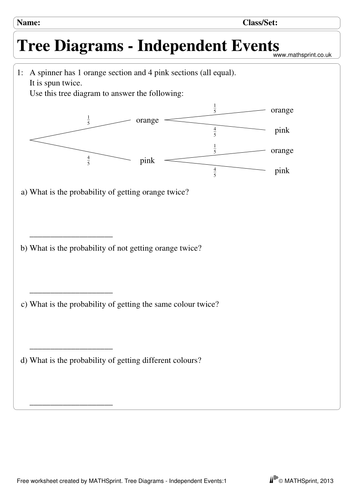 Tree diagram math worksheets. Search Printable 2nd Grade Science Worksheets - Education Spark your students' curiosity with our second grade science worksheets and printables! From explorations of plant and animal life cycles all the way to weather patterns, layers of the Earth, and the planets of our solar system, these second grade science worksheets use fascinating facts and engaging illustrations to bring science to life for your students. Factors Worksheets | Prime Factorization Tree Worksheets - Math … The Prime Factorization Tree is a great visual aids. The problems may be selected from two different degrees of difficulty. The easiest limits the number of prime factors for each problem to 3 or 4, and the hardest will allow the number of prime factors to be up to 5. These factorization worksheets will generate 6 Prime Factorization Tree problems per worksheet and the answer … Coin & Dice Probability: Using A Tree Diagram - Online Math … More Tree Diagrams Probability Tree Diagrams More Lessons On Probability Probability Worksheets. Example 1: Coin and Dice. Example: A coin and a dice are thrown at random. Find the probability of: a) getting a head and an even number b) getting a head or tail and an odd number . Solution: We can use a tree diagram to help list all the possible ... CommonCoreSheets.com: Free distance learning and math worksheets… The best source for free math worksheets and distance learning. Easier to grade, more in-depth and best of all... 100% FREE! Kindergarten, 1st Grade, 2nd Grade, 3rd Grade, 4th Grade, 5th Grade and more!
